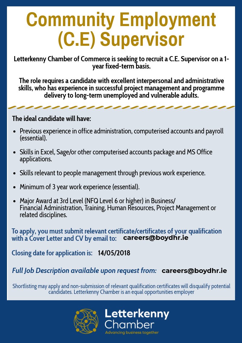 Letterkenny Chamber Lovelocal Staysafe On Twitter Vacancy Letterkenny Chamber Is Seeking Applications For The Post Of Community Employment Supervisor To Apply Send Qualifications Cover Letter And Cv To Careers Boydhr Ie Https T Co
